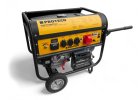 Benzínová elektrocentrála Proteco s výkonom 5500 W, AVR reguláciou, elektrickým aj ručným štartom, nádržou 25 l a výstupmi 230 V, 400 V a 12 V DC.